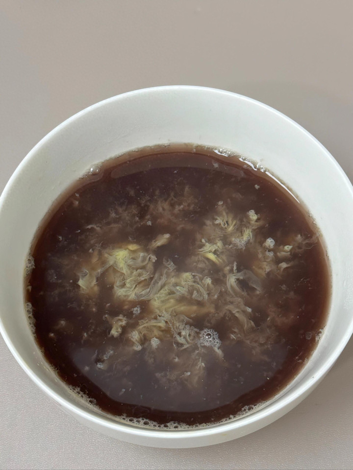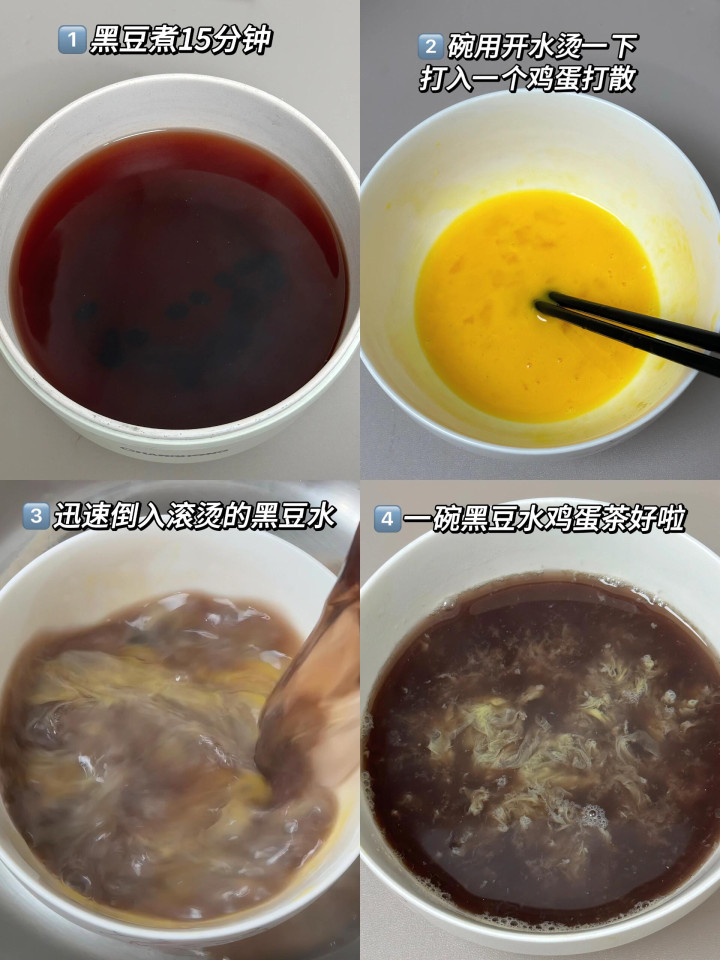 关键一步是冲鸡蛋。我妈特意叮嘱:碗先用开水烫热,打一个鸡蛋进去,快速搅散。接着,把那锅滚烫的黑豆水,高高冲进碗里,蛋花瞬间就浮起来了。